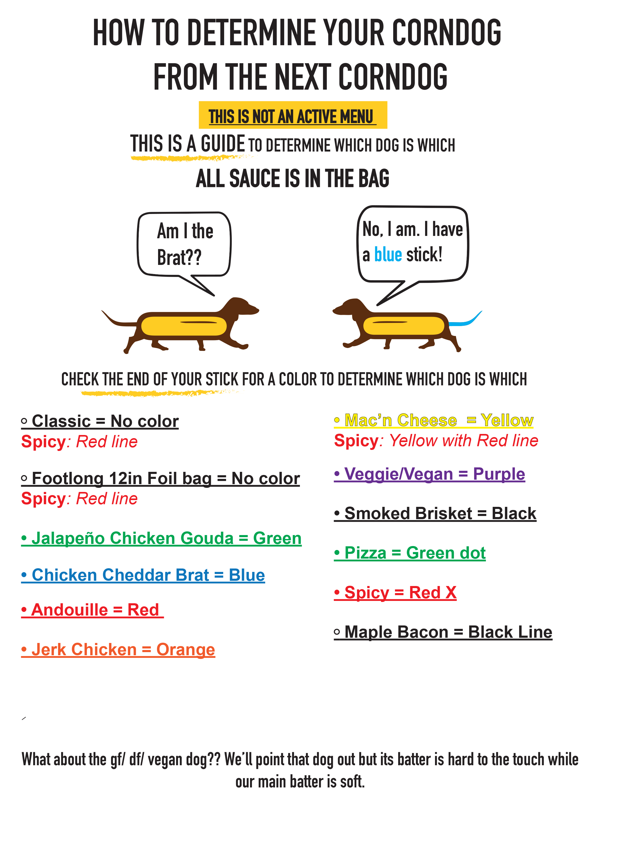 All corndogs are served in a bag with sauces inside. Use this guide to help determine which dog is which, unless you like a game of Russian roulette, a game of chance and not knowing which dog is which.